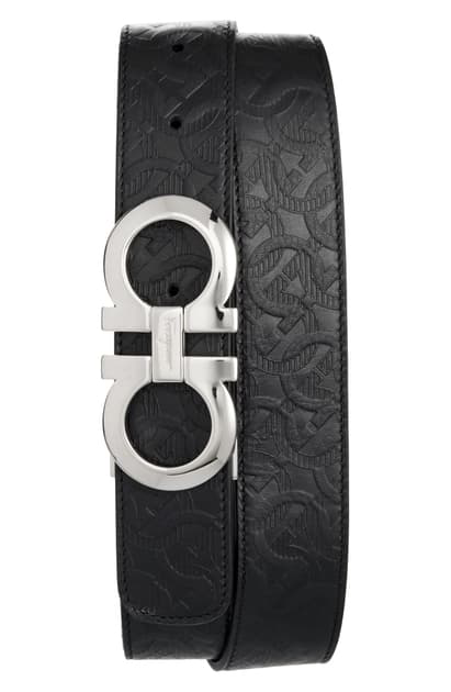 Salvatore Ferragamo Men S Double Gancini Embossed Reversible Leather Belt In Black Black Modesens
